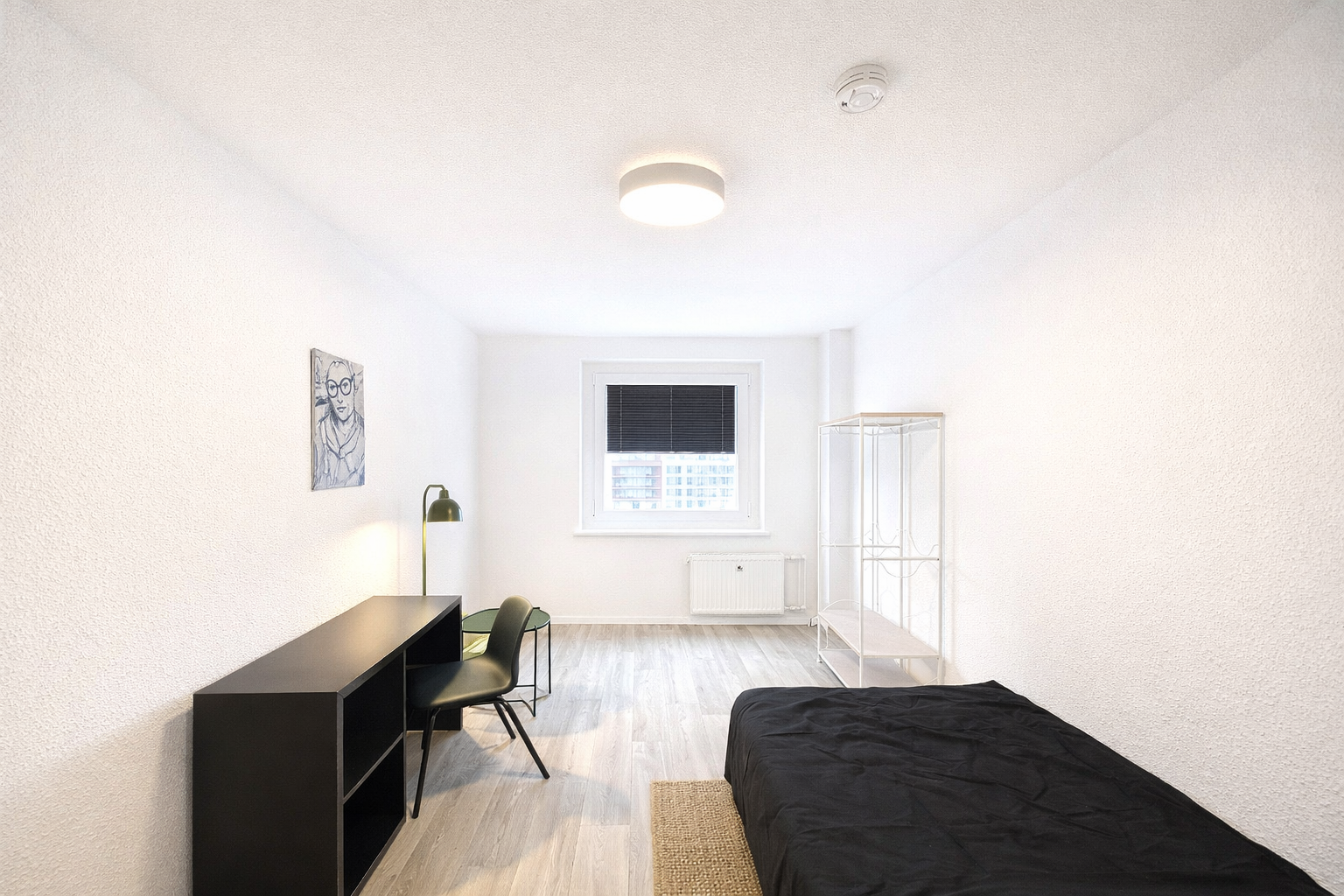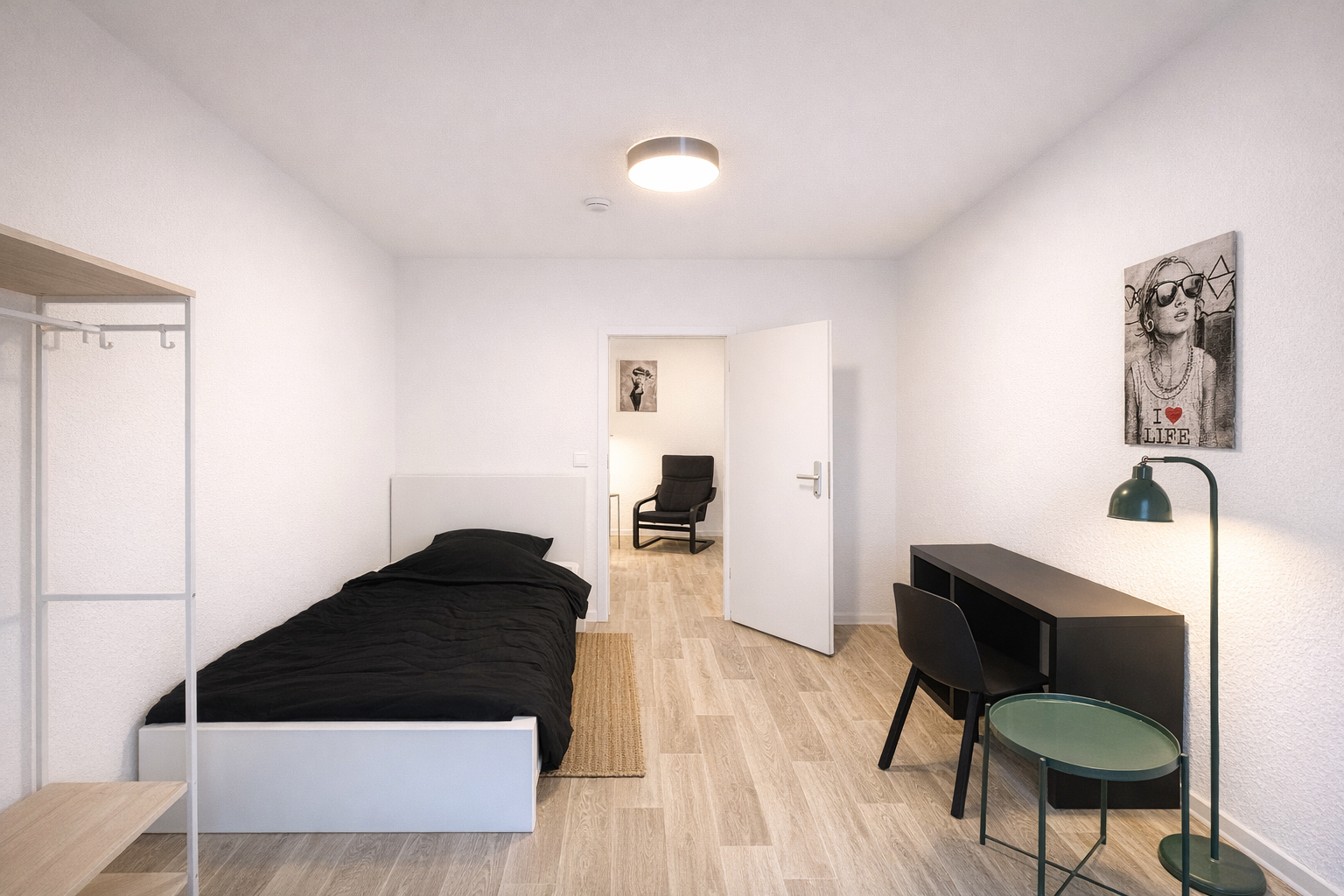 • Fully furnished with bed, mattress, wardrobe, desk, chair, and lighting