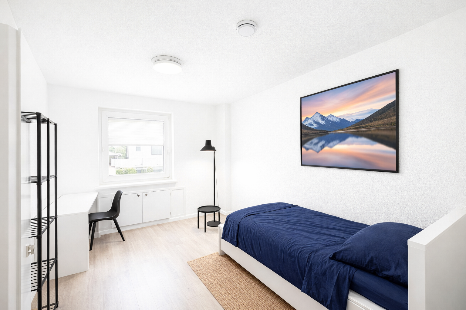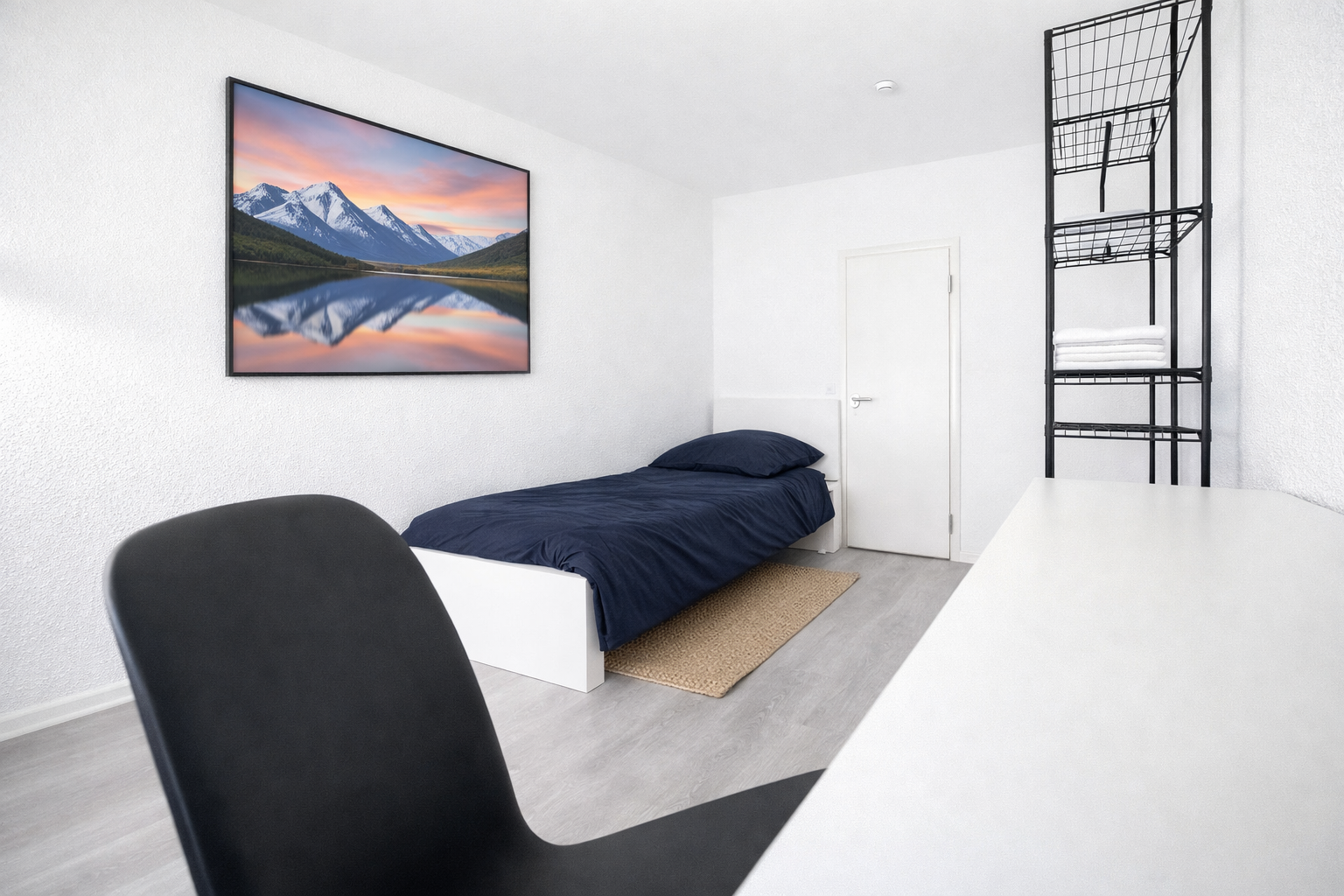 • Fully furnished with bed, mattress, wardrobe, desk, chair, and lighting