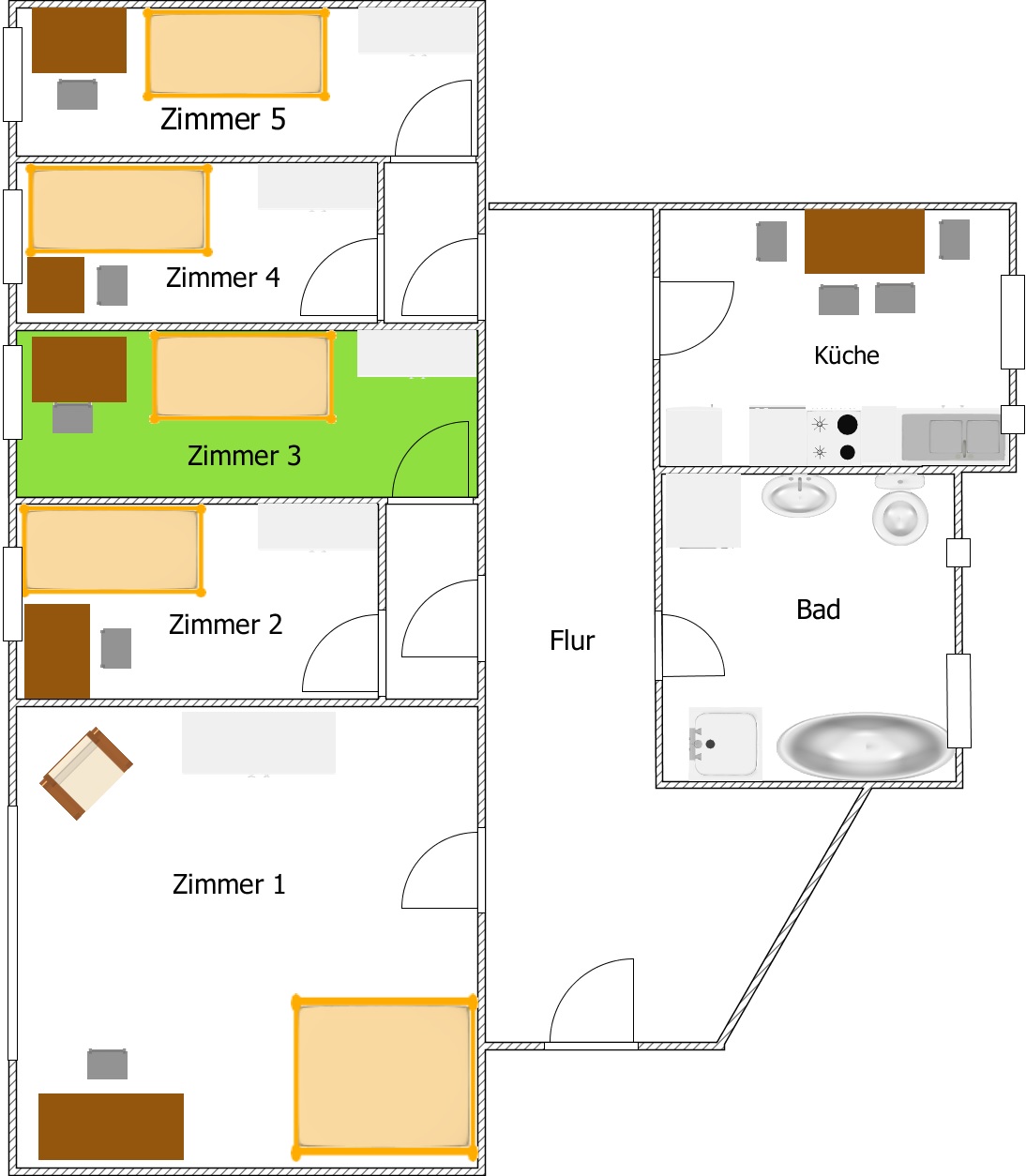 Furnishings: Bed, wardrobe, desk, chair, lockable door
