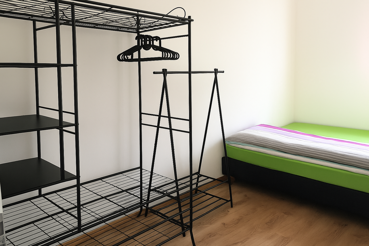 Furnished & Equipped: Bed, full bedding set (duvet, pillow, covers), desk, chair, storage racks