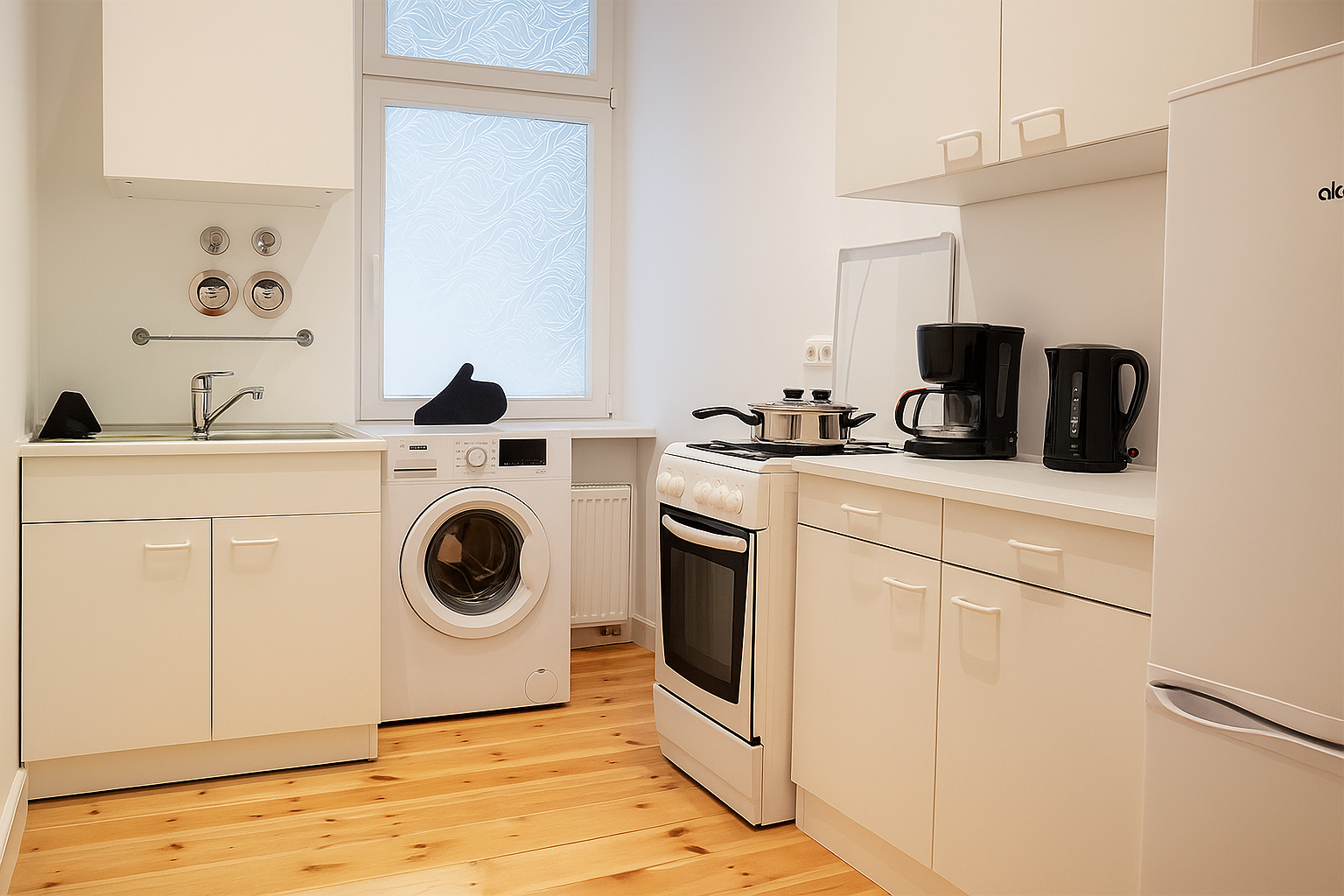 Fully equipped kitchen with refrigerator, oven, washing machine, vacuum cleaner, and WiFi router