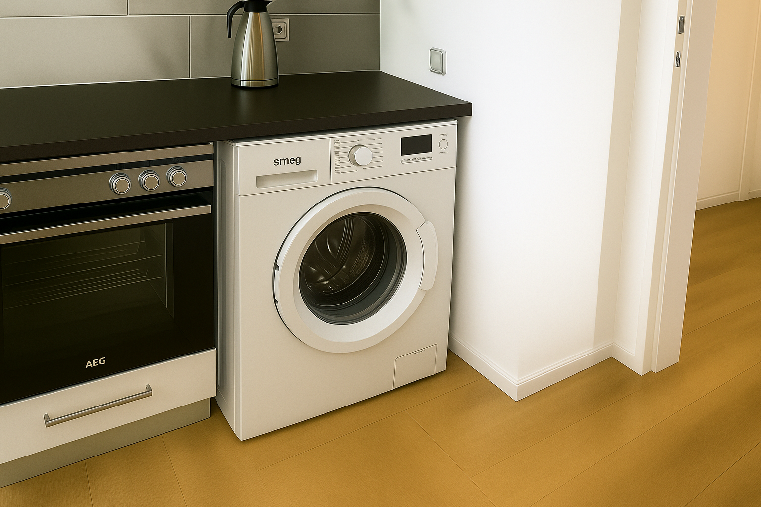 Fully equipped kitchen with refrigerator, oven, washing machine, vacuum cleaner, and Wi-Fi router