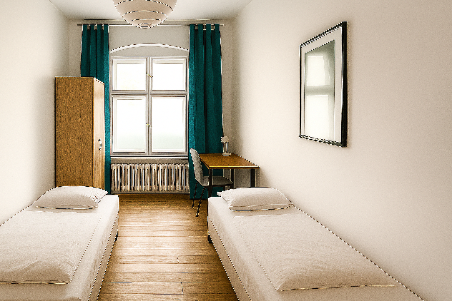 The flat offers 3 private rooms and 2 shared rooms, combining comfort, affordability, and community living — perfect for students, trainees, and young professionals.