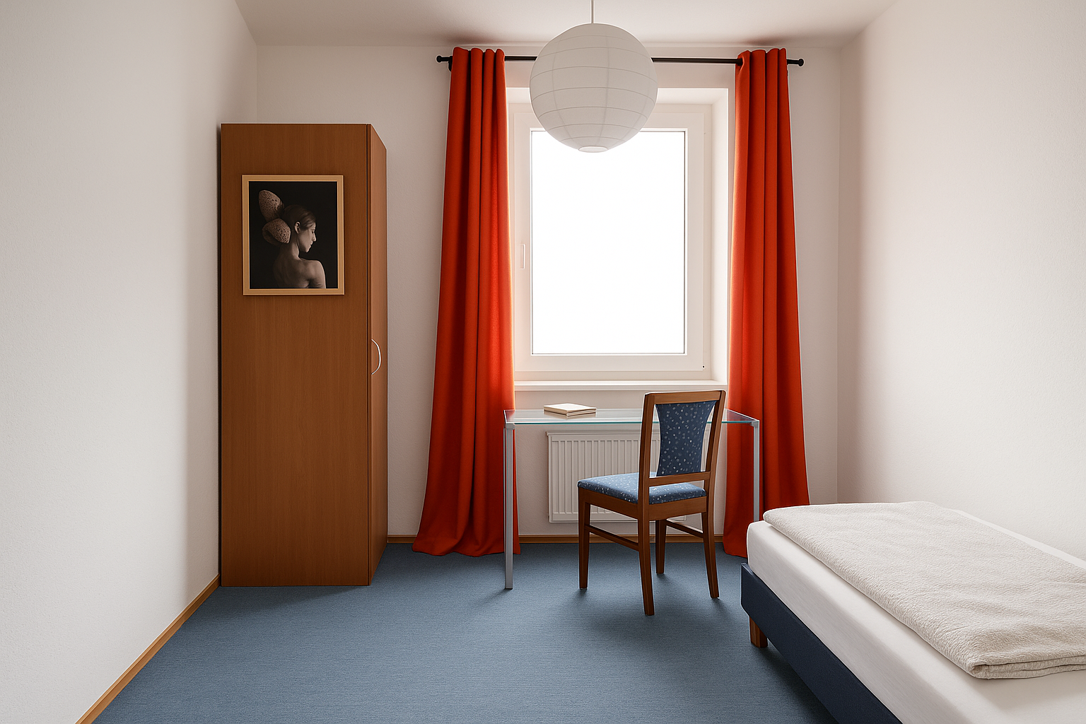 ✔ Private Furnished Room – 13 m², lockable, equipped with bed, wardrobe, desk & chair