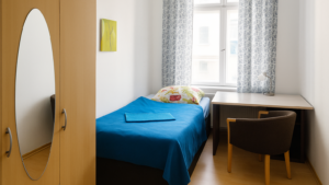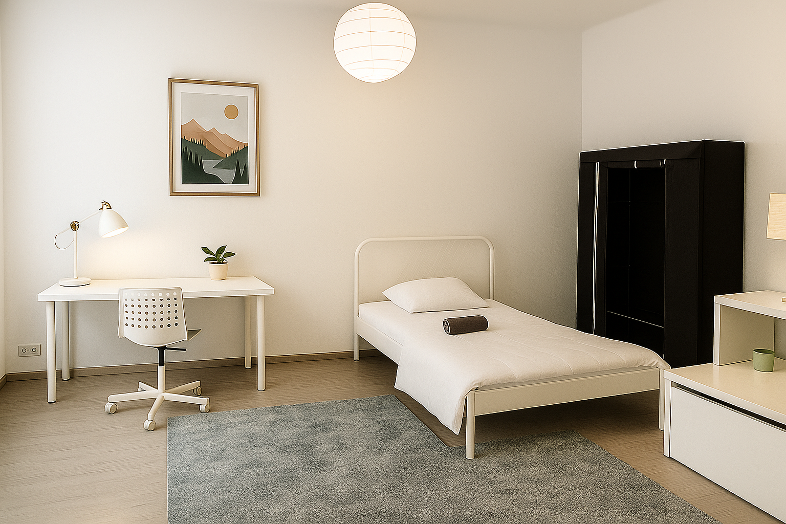 ✔ Private Bedroom: 14 m², furnished with bed, wardrobe, desk, chair & lockable door