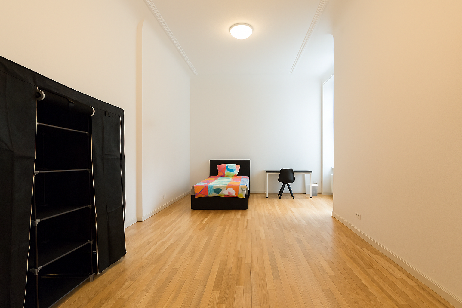 âś” Furnishings: bed, wardrobe, desk, chair, storage furniture, lighting