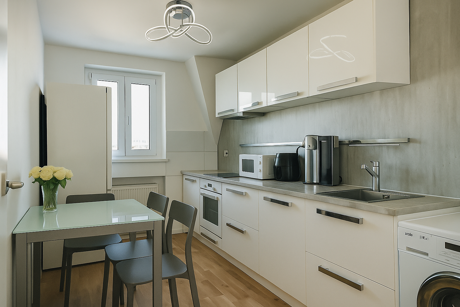 Fully equipped kitchen with refrigerator, oven, washing machine, vacuum cleaner, and WiFi router